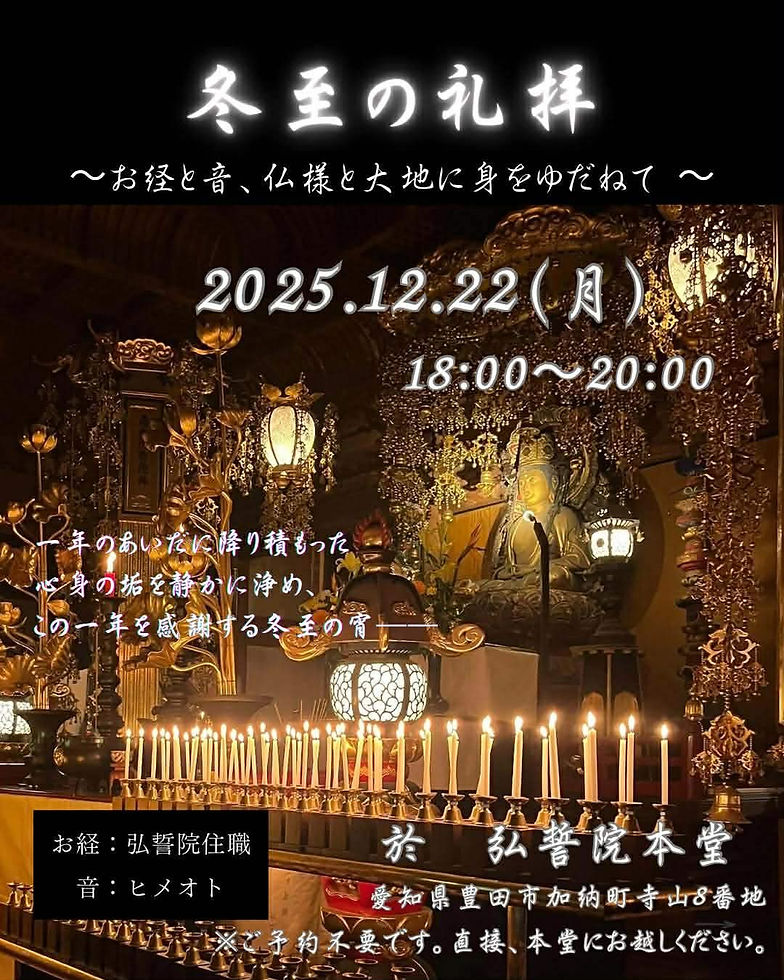 さて、弘誓院でも年末恒例の心のお掃除、礼拝会を冬至の日に、今年はヒメオトさんと共催で【音とお経の礼拝会】として開催致します。